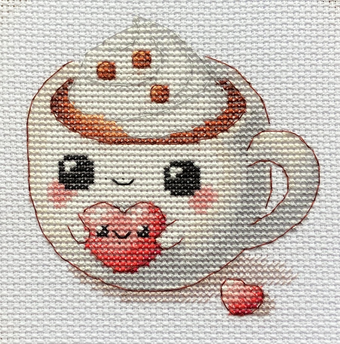 Ten uroczy wzór do haftu krzyżykowego przedstawia filiżankę gorącej czekolady w stylu kawaii z wesołą, uśmiechniętą buzią. Filiżanka obejmuje urocze, różowe serce z małym, szczęśliwym wyrazem twarzy, promieniując ciepłem i uczuciem. Bogaty, czekoladowy napój jest zwieńczony puszystym kleksem bitej śmietany, ozdobionym drobnymi czekoladowymi kropelkami, co wzmacnia przytulny i słodki klimat.